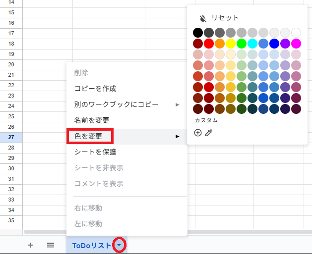 シートタブのシート名の右側にある赤丸で示した矢印ボタンをクリックし、「色の変更」を選択すると、右側にカラーパレットが出てくるので、お好みの色を選択しましょう。